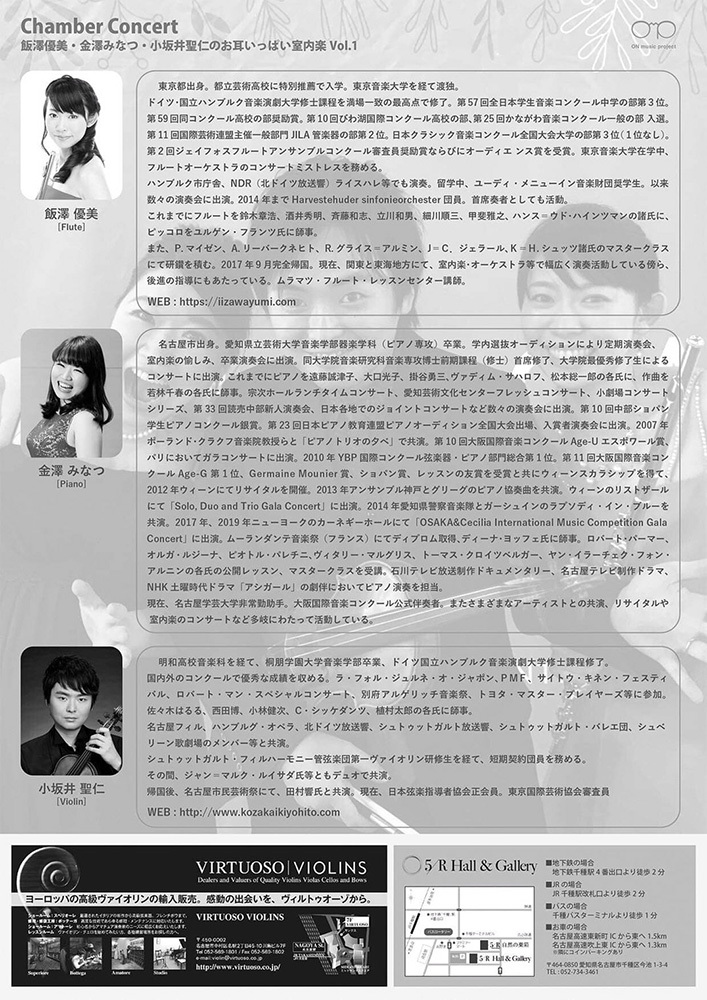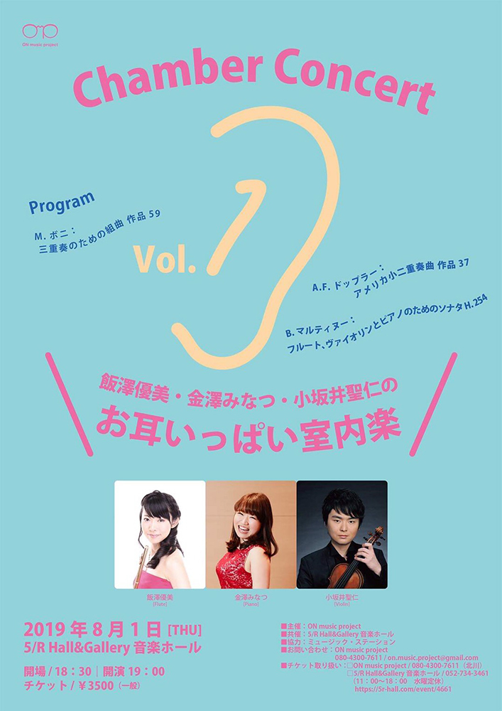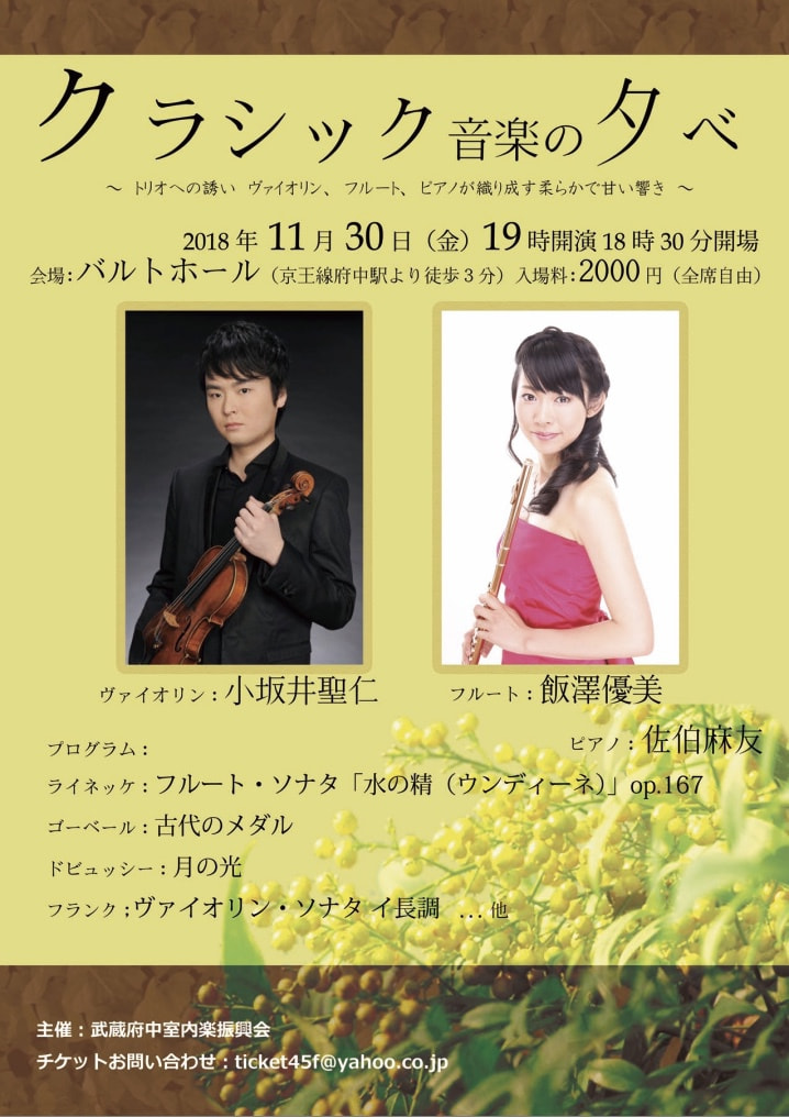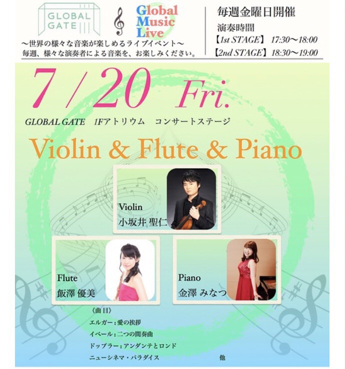 日時:7月20日(金) 第一部17:30〜 第二部18:30〜 出演者:フルート 飯澤優美 / ヴァイオリン 小坂井聖仁 / ピアノ 金澤みなつ
